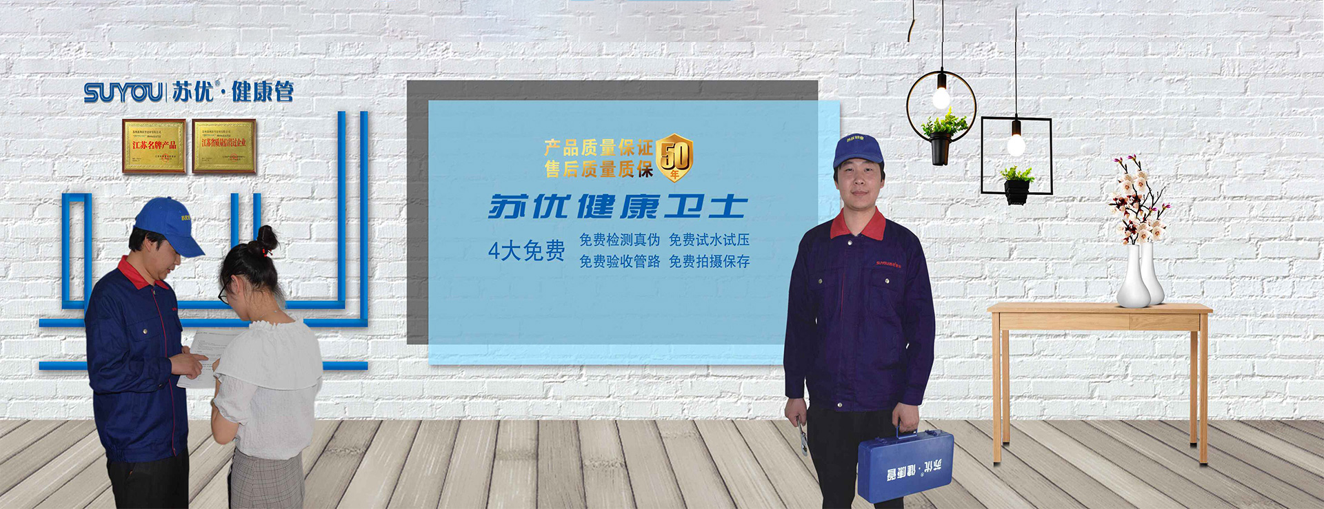 小區廣告—門頭立柱,墻體廣告,公交專線等精確投放。專業配套物料含:貨架,形象墻,展板,數顯焊機,剪刀,工作服,智能試壓機等,讓你打造蘇優品牌得心應手。
